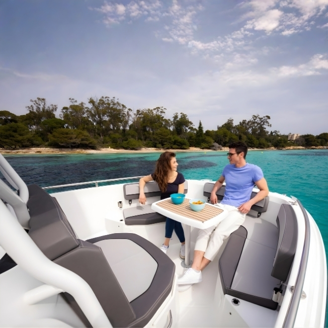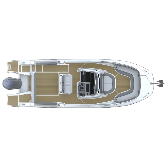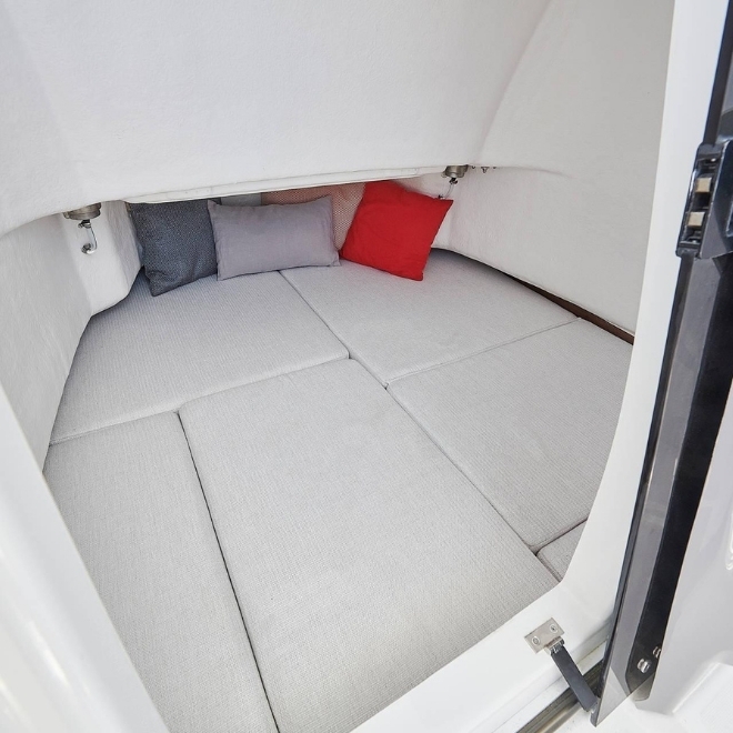 Ambarcațiunea pune accent pe funcționalitate și libertate de mișcare pe punte. Cockpitul este spațios și configurabil, oferind acces facil în jurul consolei centrale, platforme de baie integrate și spații inteligente de depozitare. Consola ergonomica permite un control precis al ambarcațiunii, iar finisajele premium asigură confort și durabilitate.